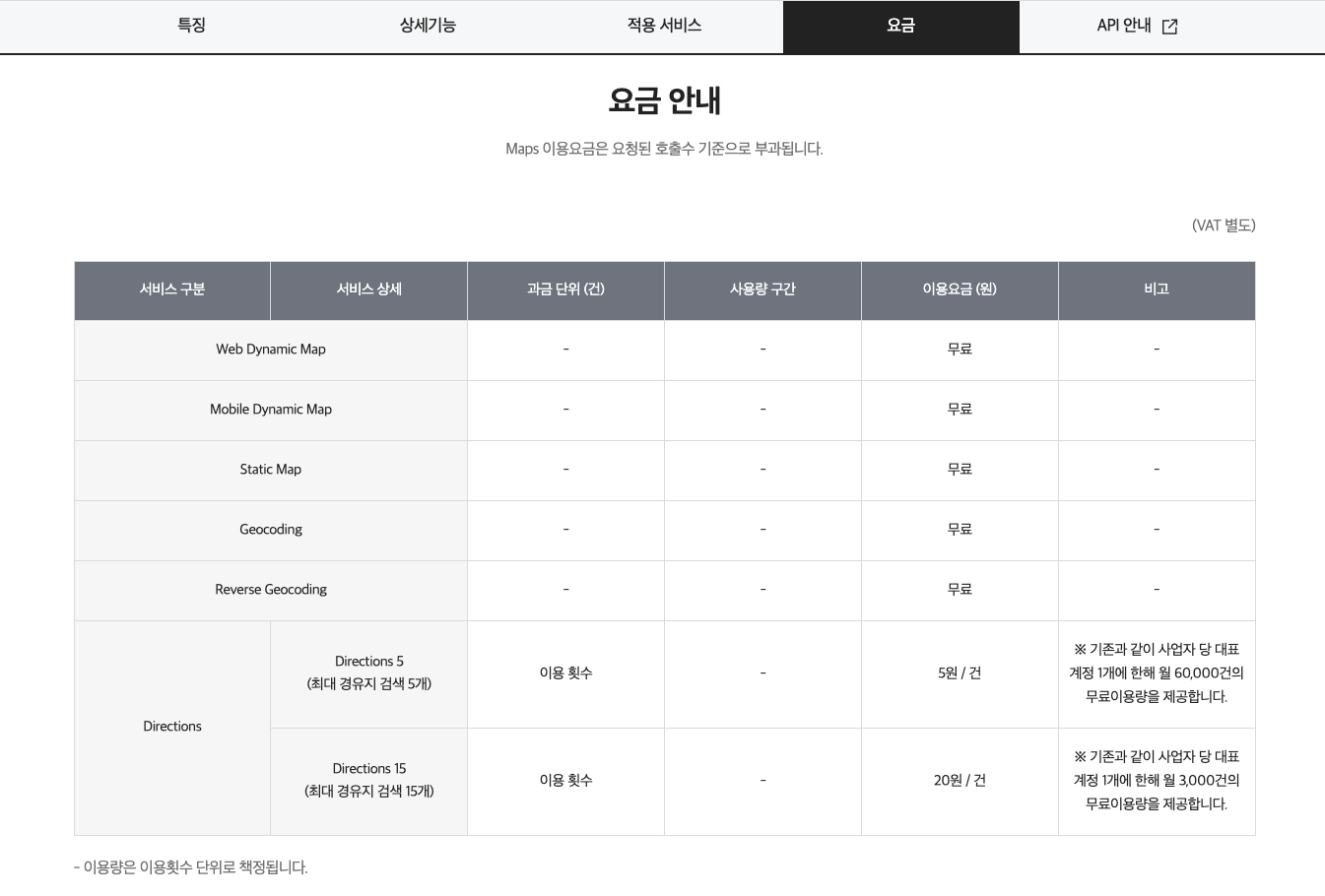 * 현재는 네비게이션 기능인 (경로검색) Directions 기능을 제외하고 전부 무료로 제공된다.