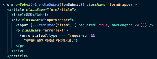 - react-hook-form 에서 제공하는 useForm() 훅으로 form 제출 / 유효성 검사에 대한 에러 처리가 함께 가능하다.
