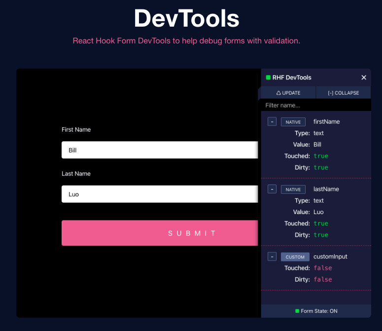 인스톨 후 <form /> 태그 외부에 <DevTool control = {control} /> 코드를 입력하면 아래 화면과 같이 devTools 를 이용할 수 있어 디버깅 시 용이하다.